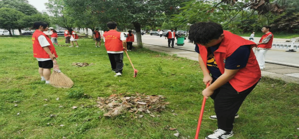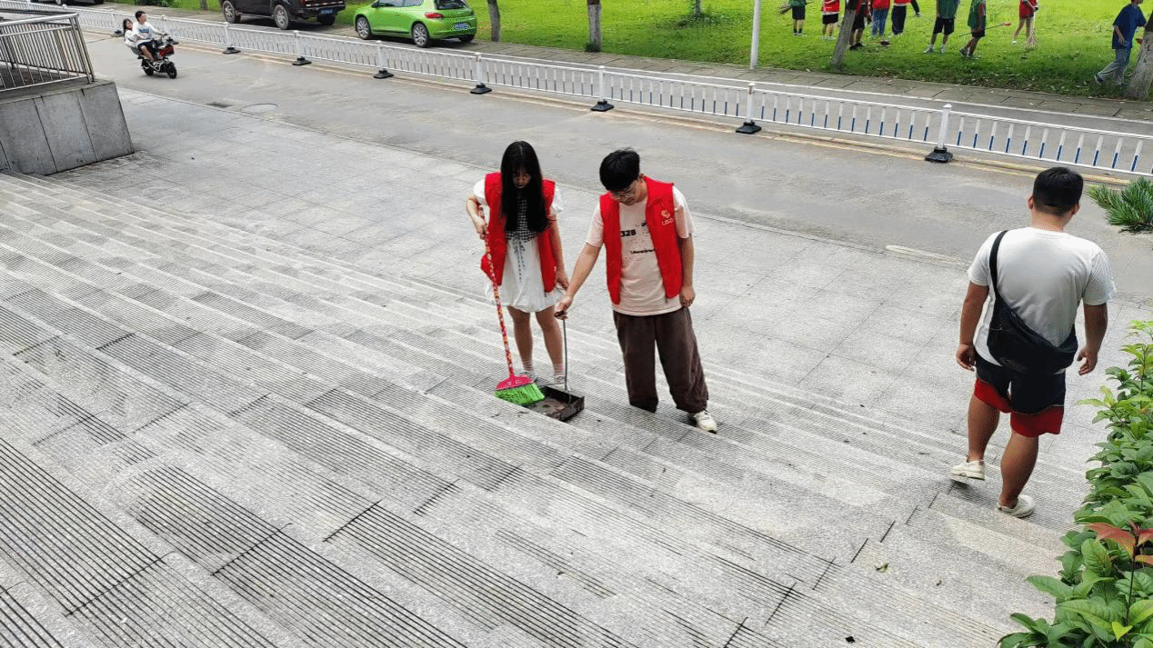 (同学们在逸夫楼前空地打扫卫生)