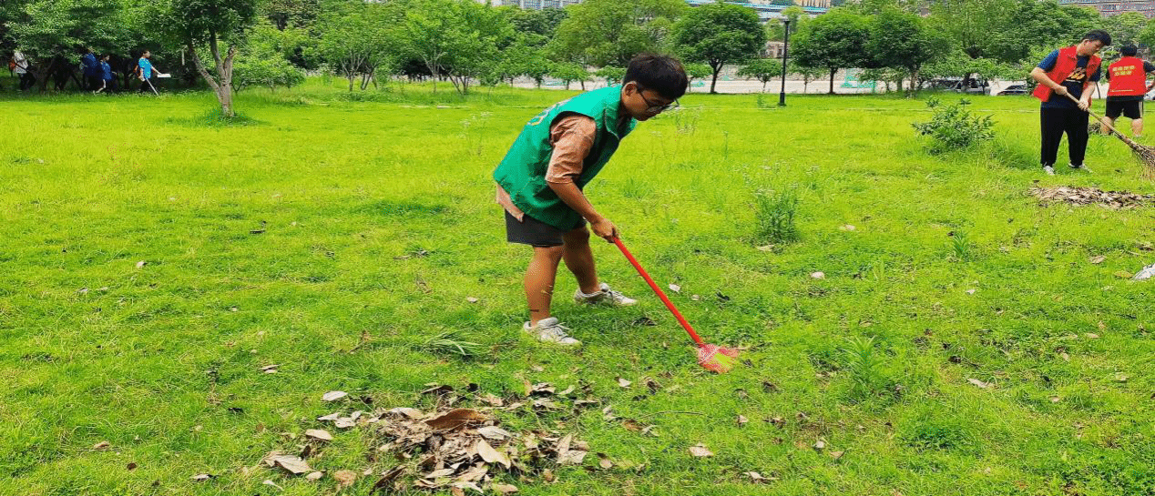 (同学们在草坪打扫枯叶)