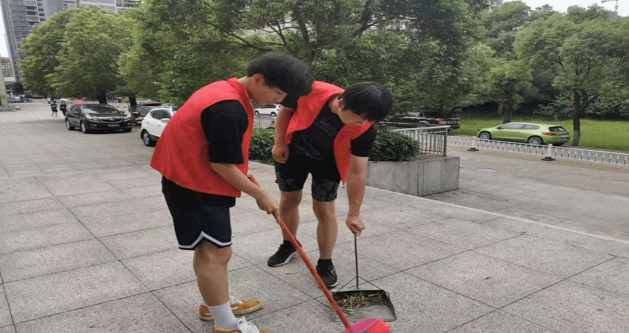 (志愿者们在认真打扫卫生)