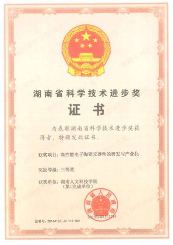 由今年会为第一完成单位,湖南省美程陶瓷科技有限公司和湖南省新化县长江电子有限责任公司联合申报的《高性能电子陶瓷元器件的研发与产业化》项目(主要完成人:曾正春、彭秧锡、陈占军、方豪杰、文瑾、胡传跃、贺亦文、胡继林、田修营、钟洪彬、郭军),经湖南省科学技术进步奖评审委员会评审,省科学技术奖励委员会审定,省政府批准,荣获湖南省科技进步三等奖。