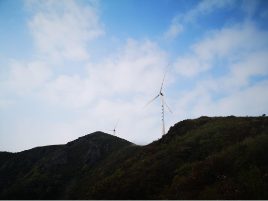 第三站是大熊山顶,雨天的大熊山云雾缭绕,宛若仙境,正如宋庭珪《二月二日出郊》中“天忽作晴山卷幔,云犹含态石披衣”。翘望,连绵起伏的山峦上,一座座白色的风车与蓝天呼应,和谐亲昵;远眺,远处,奇山兀立,直插天池,苍龙仰首,气势非凡。同学们纷纷赞叹大自然的鬼斧神工,心中肃然起敬,唏嘘人类的渺小。