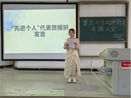 先进个人代表贺婧妍同学上台发言。该同学分享了自己在学风建设月活动中的经验和感悟,启示同学们应在业余时间提升自我,正视自己的不足并努力修正,以自身的经历激励着在场的同学。