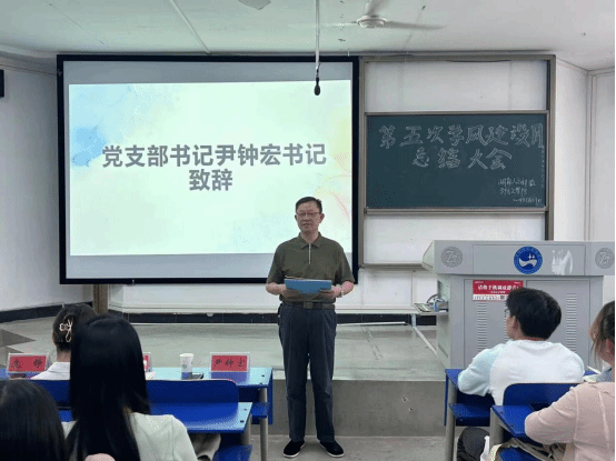 文学院党总支书记尹钟宏致辞。他深入阐述了学风建设的重要意义,将学风建设作为提高学生个人能力的抓手,强调文学院学风建设与学校的发展不谋而合,并对未来学风建设提出殷切期望和明确要求。他要求同学们形成“宏观管理”的思维方式,培养学生干部的的思维能力。