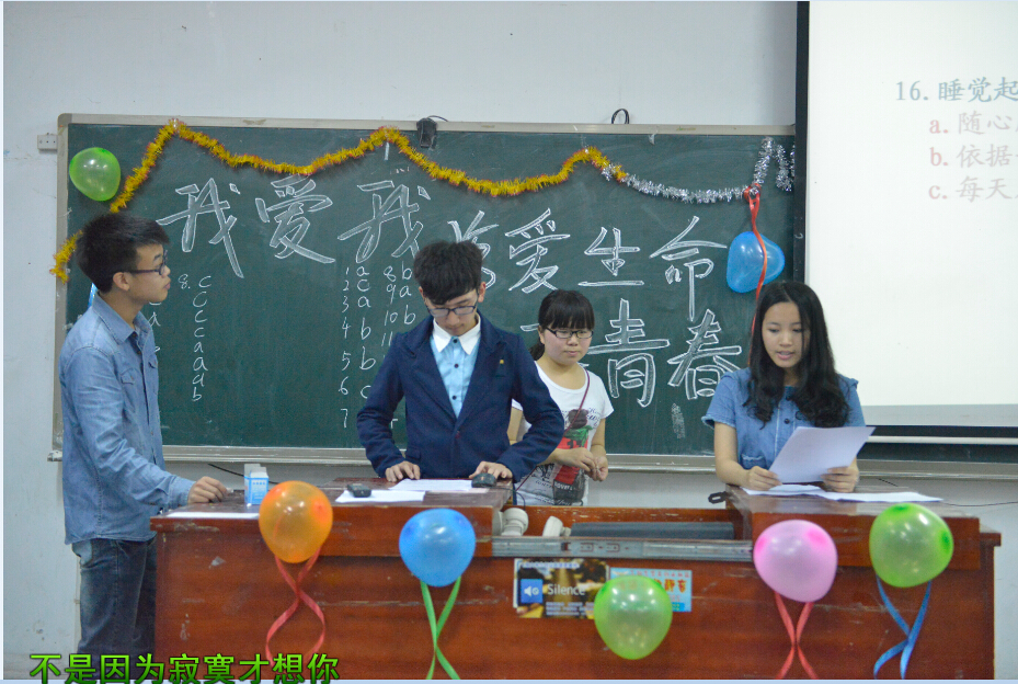 2014年5月23日晚七点半,由今年会学生工作处主办、中文系学生会心理部承办的中文系以“我爱我——珍爱生命放飞青春”为主题的心理交流会在致远楼211教室隆重举行。中文系辅导员叶红老师、中文系学生会主席助理孙阳、中文系学生会心理部长邓桂茜出席了本次晚会。中文系13级各班班干部以及其它各年级的代表参与了此次晚会。