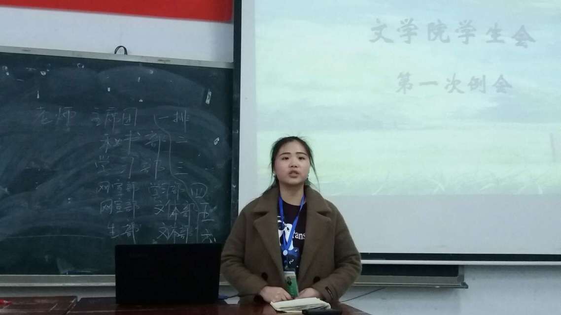 会议开始,由秘书部部长廖婧文发言。为迎接学生会换届,本学期将实行代理部长。有留任意向的干事将有机会担任代理部长,期间的工作情况将作为换届考核的重要依据。增加周总结。新增学生会考勤制度,将影响学生会成员的评优评先。