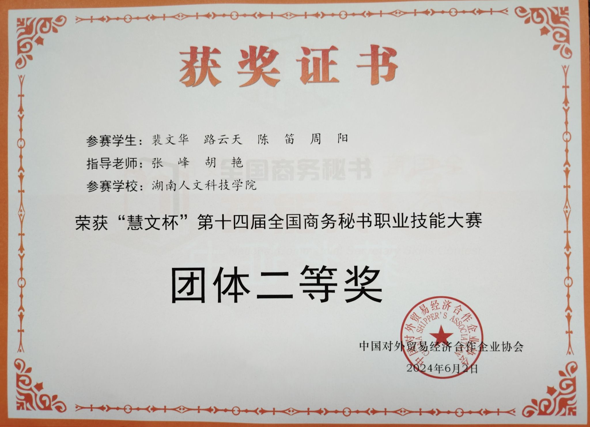 大赛由中国对外贸易经济合作企业协会主办,湖南司法警官职业学院和全国商务秘书与行政助理专家委员会承办,中国对外贸易经济合作企业协会全国外经贸从业人员考试中心协办。6月1日全天进行了全部赛项的比赛。大赛包括秘书专项事务处理、秘书综合事务处理、秘书工作情境展示3个主体实践赛项,综合考查选手的专业技能和团队合作能力等素养。我院两支代表队,经过激烈角逐,代表一队裴文华队获得团体二等奖,代表二队罗轩队获得团体三等奖。