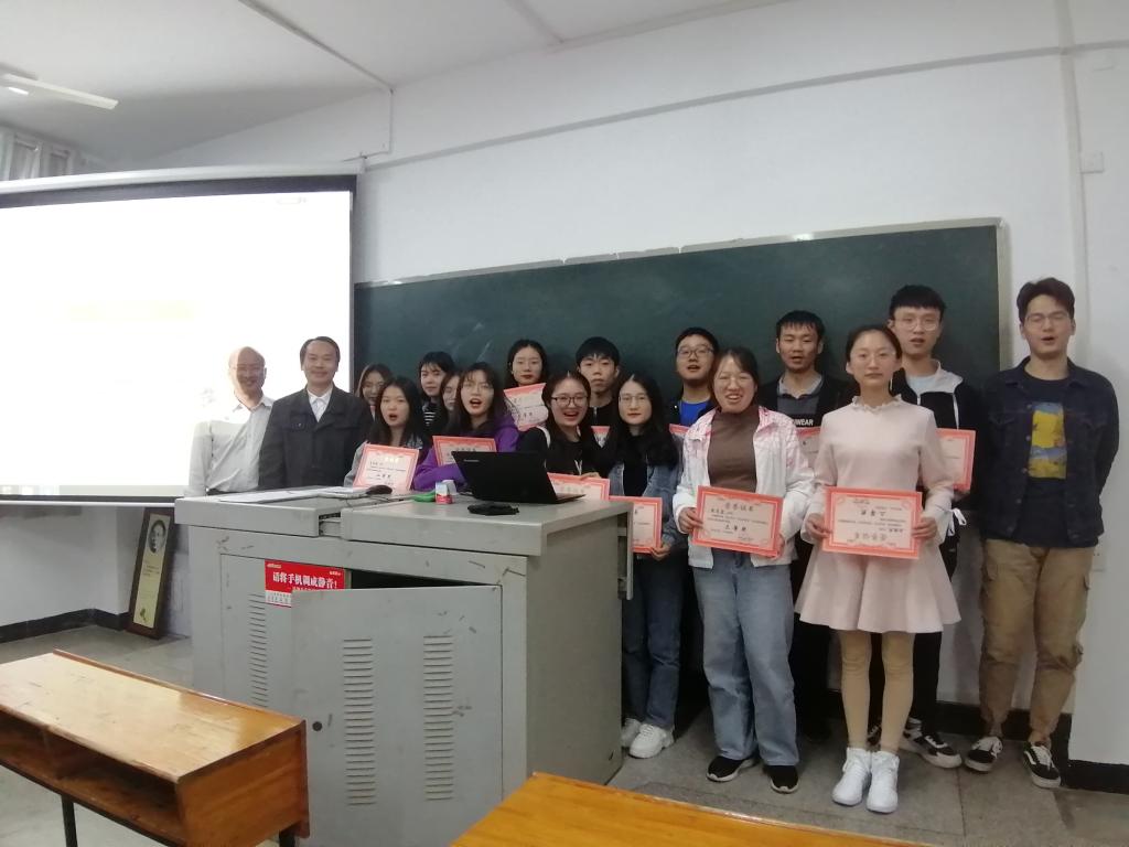 颁奖仪式由文学院资深教师张峰主持,文学院院长黄立平担任颁奖人。16位同学从黄院长手中接过获奖证书,并与两位老师合影留念。张峰老师首先祝贺16位同学获得初赛预设的奖励。他指出了本次比赛中参赛选手的不足,并对获奖同学的作品一一进行点评。最后,他鼓励同学们课后努力练习写作,并表示以后将继续举办类似活动,提高同学们的写作能力。