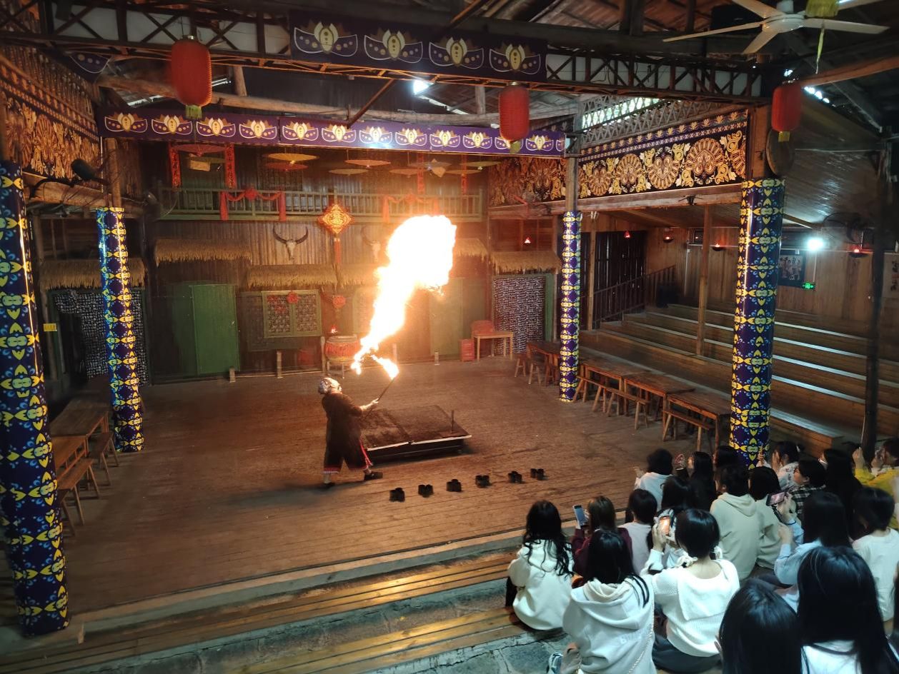 一场集广西侗族苗族风情于一身的大型歌舞盛宴,于26日晚在蝴蝶泉景区登场。《侗王夜宴》演绎了传承千古的原始场景,敬酒迎宾、寨花对歌、行歌坐月等等,侗族与苗族同胞用他们磁性的歌喉、奔放的舞蹈感染着师生,师生也渐渐融入进去,在苗乡侗寨传统精美的建筑风雨长廊、天籁鼓楼、多耶广场中一起载歌载舞,激情狂欢。晚会结束,师生相约阳朔西街,霓虹灯与星空点亮这座小城,游人和店主构成小城的主体,繁华的街头人行漫漫。西街的夜景无一人不流连忘返。