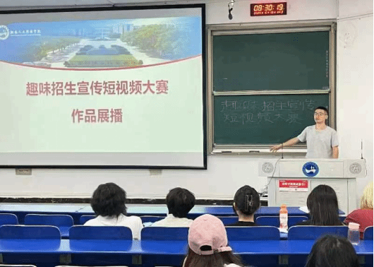 文学院为提前做好高考前后招生宣传工作,展现文学院风采,5月10日—6月18日,依托网络与新媒体专业,通过《新媒体营销概论》课程实践,结合学院招生宣传工作,打造了趣味招生宣传短视频大赛,在抖音平台上发布、运营和传播。21级网络与新媒体一班全体同学以及部分22级同学参加本次比赛。6月19日,趣味短视频大赛颁奖典礼于致远楼219教室隆重举行,本次颁奖典礼由唐久乐老师主持,学院副院长罗主宾、网络与新媒体调研室主任马黎出席本次活动,22级全体同学到场观看。