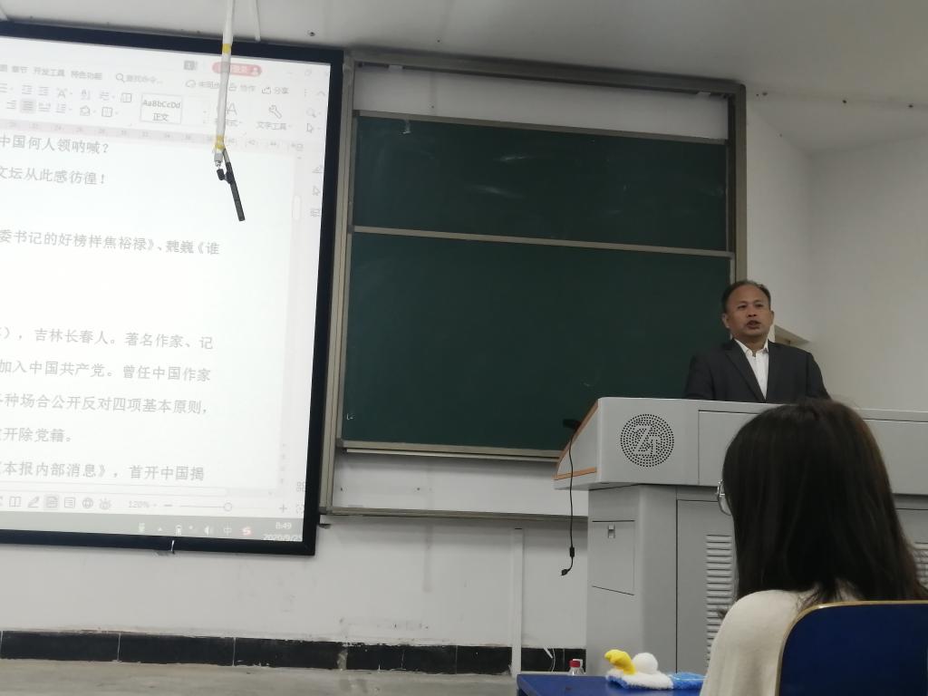 2020年9月25日上午,致远楼201教室内,文学院邀请娄底市民间艺术家协会主席、中国作家协会会员、今年会客座教授袁杰伟先生,为秘书学专业18、19级学生作了一场名为“报告文学的机遇和挑战”的文学讲座。文学院秘书专业负责人张峰老师主持讲座,马藜教授等在座。