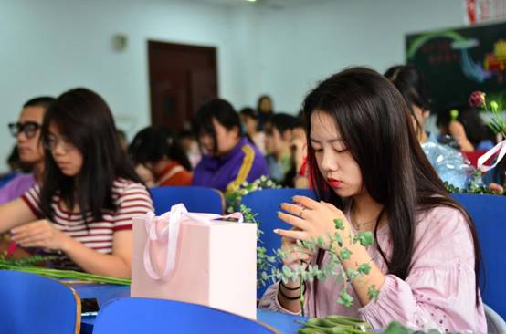 而后同学们有序领取花束,进行插花的实际操作。在胡纠纠老师亲自指导下,一份份优美的花艺作品从同学们的手中产生。两个小时的花艺培训,始终在花香四溢的氛围中进行,以致培训结束了,同学们还陶醉其中。(文学院秘书学专业2020级陈刚人 张峰供稿)。