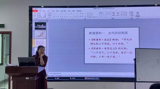 刘老师通过介绍李白、杜甫等诗人的背景,导入了本次示范课课文《石壕吏》,她通过提问题的形式要求同学们带着问题和注释理解诗文,引导同学们对诗文进行分析。她表示,同学们要从诗文内容入手,层层递进,灵活引导学生进一步理解人物情感,探究诗人所表达的思想感情。刘老师以“藏问于答,明暗结合”的方式,为同学们分享了讲解古体诗韵律的技巧。刘老师用抑扬顿挫的声音和极具特色的讲解方式让课堂变的更加生动,增强了互动性,点燃了同学们的热情。