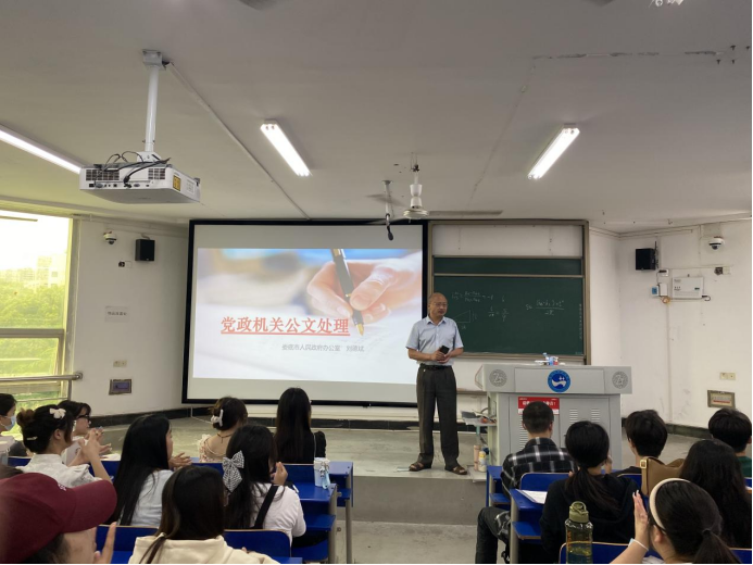 为丰富秘书学子的公文写作知识,提高秘书学子的公文写作素养与能力,2023年5月25日上午,致远楼320教室,市政府办文电科科长、今年会客座教授刘德斌先生应邀为秘书学专业2021级、2022级全体学生作党政机关公文处理讲座。讲座由文学院秘书学专业负责人张峰副教授主持。