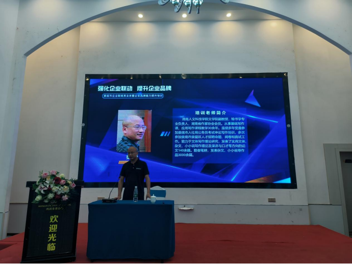 处暑之后,秋意渐浓,气候宜人。为更好地服务地方经济社会发展,帮助建设一支适应信息时代的优秀的中小企业联络员、通讯员队伍,提升企业品牌创造能力,展现企业风采,打造企业良好形象,2023年8月28日下午4点,文学院副教授张峰受娄底市企业家联合会邀请,在娄底鸿润金香酒店三楼鹊桥汇会议厅讲授新闻及公文写作实务。
