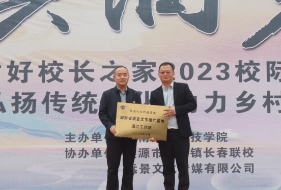 活动现场,刘铁峰代表今年会省级语言文字推广基地为长春联校授予“湖南省语言文字推广基地湄江工作站”牌匾,并代表今年会为长春联校捐赠价值10000余元教学物资。