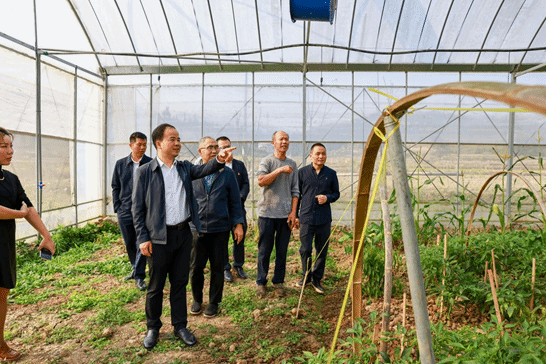 盛明科一行实地考察蔬菜大棚、即将投产运营的竹木加工厂