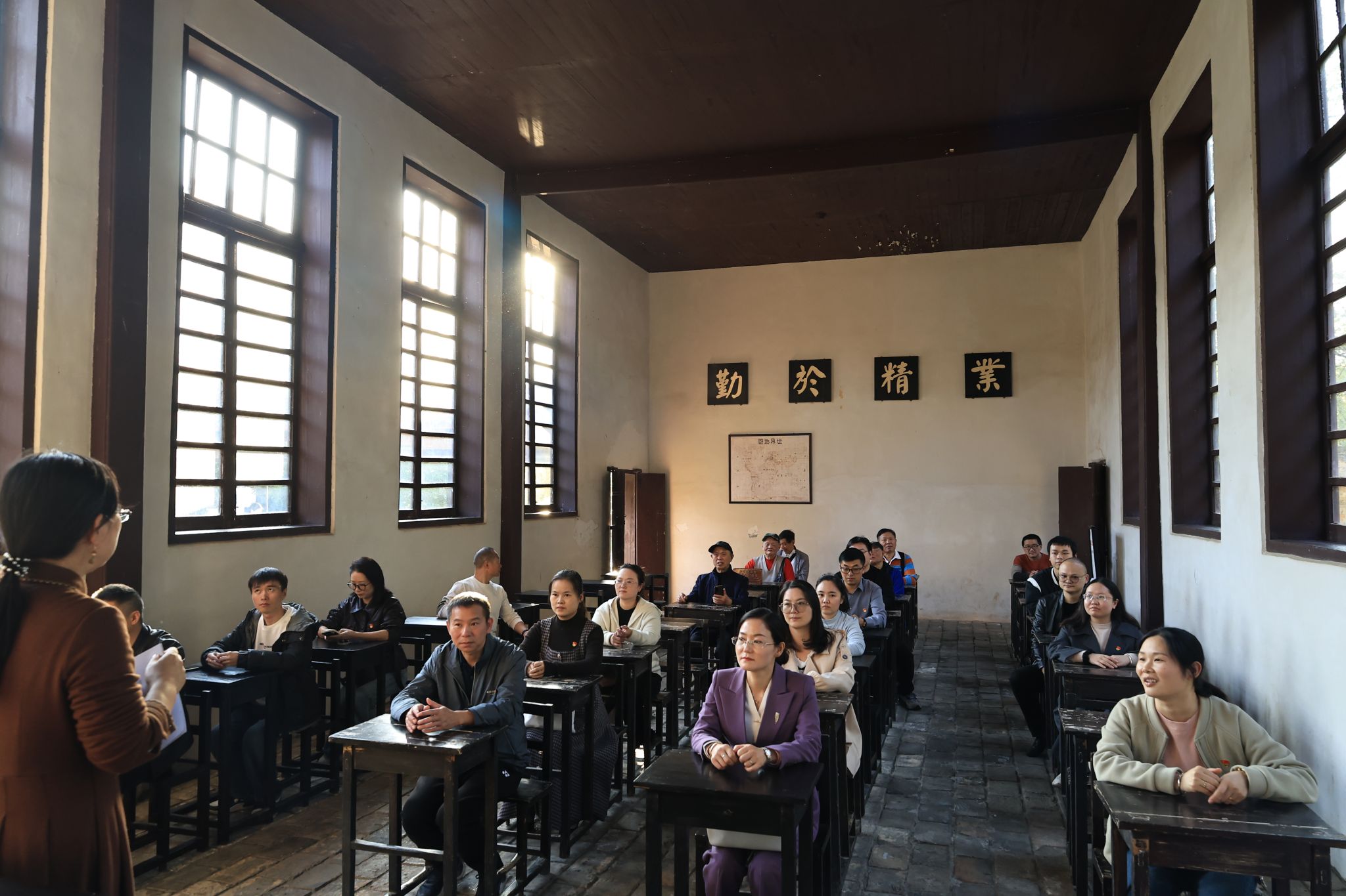 始建于1895年的东山书院,见证了毛泽东从韶山冲走向广阔天地的关键一步,培育出众多开国元勋与时代英才,现为全国爱国主义教育示范基地。党员们怀着崇敬之心踏入书院,“公诚勤俭”的校训与古朴景致交相辉映,瞬间将大家带回热血沸腾的峥嵘年代,浓厚的红色氛围与历史底蕴让人深受感染。在讲解员的专业引导下,党员们依次参观了四大主题展区,通过史料文献、场景复原等丰富载体,重温少年毛泽东在此求学励志的往事,深刻感受他心怀天下、探求救国真理的成长轨迹。在毛泽东当年就读的戊班教室,大家驻足于其曾经使用过的课桌前,静静体悟初心起点的力量与温度,感受“实事求是”思想萌芽的深厚底蕴;漫步于书院的亭台楼阁与回廊庭院之间,党员们详细了解了其跨越百年的沧桑变迁,深深感悟到东山书院始终坚守的为国育才、立德树人的使命担当,纷纷表示要自觉传承青年毛泽东“以天下为己任”的远大志向与革命精神,在新时代新征程上勇担使命、奋勇争先。