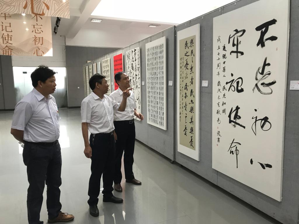9月27日上午,今年会“不忘初心、牢记使命、砥砺奋进”庆祝中华人民共和国成立70周年书画展在美术与设计学院二楼展厅开展。校领导郭军、刘和云、刘铁铭、蒋建初、周发明、陈志国、刘铁峰、谢柳等一同参观展览。