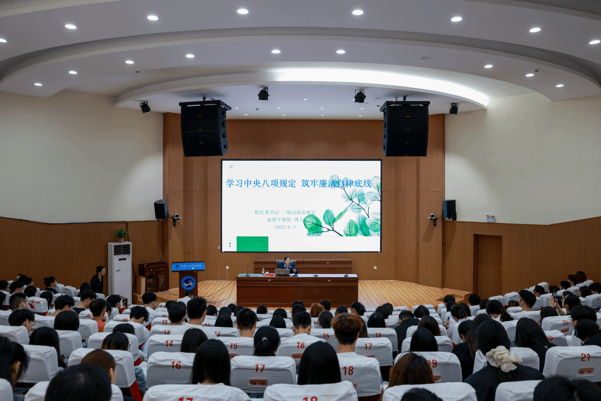 6月3日下午,学校党委委员、纪委书记凌艳平教授以《学习中央八项规定 筑牢廉洁自律底线》为题,为2025年第一期党员发展对象授课。